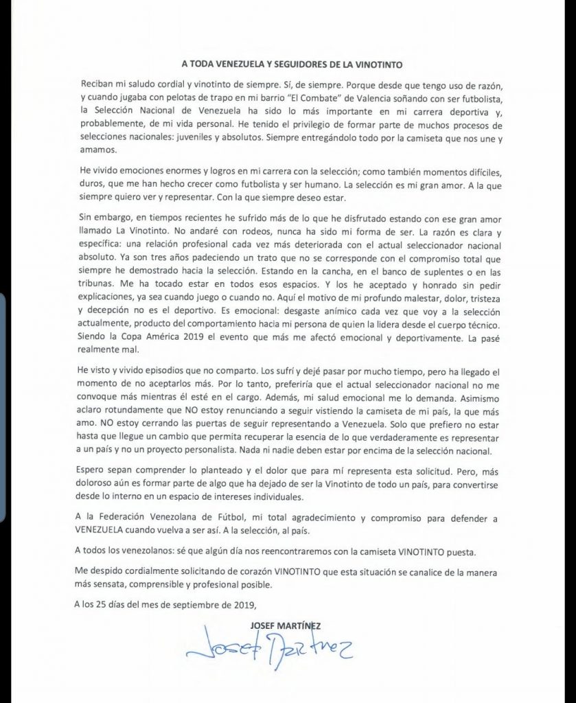 El atacante de la Selección Nacional de Venezuela, Josef Martínez, anunció este jueves 26 de septiembre su retiro de la selección Vinotinto mientras siga entrenando Rafael Dudamel debido a "intereses personales" que denuncia la estrella del Atlanta United del fútbol de los Estados Unidos.