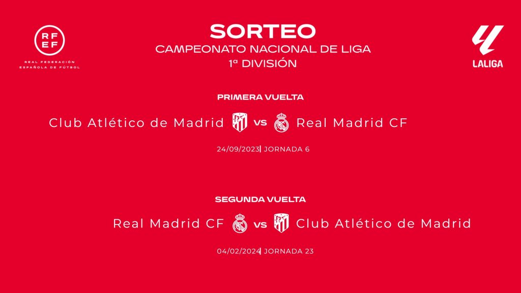 Los dos grandes de la capital de España se verán las caras en la ida en el Cívitas Metropolitano (Jornada 6) y en la vuelta lo harán en el estadio Santiago Bernabéu (Jornada 23).