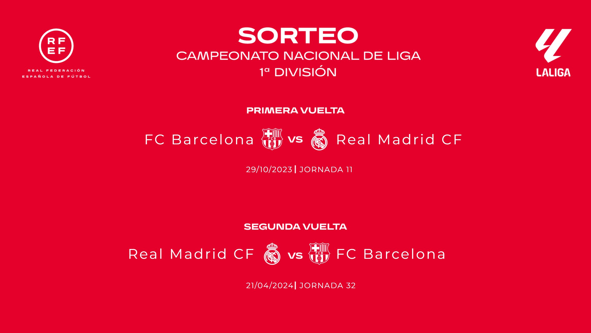 Real Madrid y Barcelona se enfrentarán primero en el estadio Olímpico Lluís Companys (Jornada 11) y después lo harán en el estadio Santiago Bernabéu (Jornada 32), dos fechas que están marcadas en el calendario de todos los aficionados del fútbol mundial.